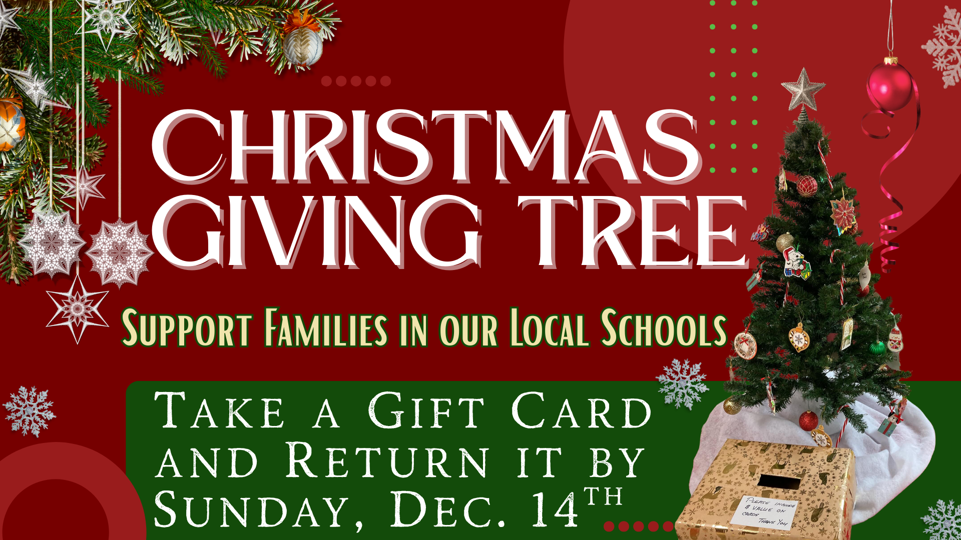 Support our local schools. Our giving tree is located in our fireside room.